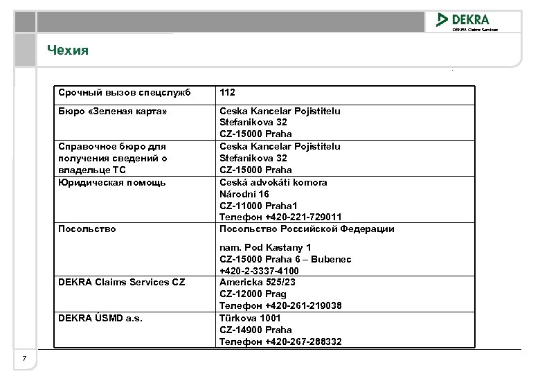 DEKRA Claims Services Чехия Срочный вызов спецслужб 112 Бюро «Зеленая карта» Ceska Kancelar Pojistitelu Stefanikova 32 CZ-15000 Praha Ceská advokátí komora Národní 16 CZ-11000 Praha 1 Телефон +420 -221 -729011 Посольство Российской Федерации Справочное бюро для получения сведений о владельце ТС Юридическая помощь Посольство DEKRA Claims Services CZ DEKRA ÚSMD a. s. 7 nam. Pod Kastany 1 CZ-15000 Praha 6 – Bubenec +420 -2 -3337 -4100 Americka 525/23 CZ-12000 Prag Телефон +420 -261 -219038 Türkova 1001 CZ-14900 Praha Телефон +420 -267 -288332