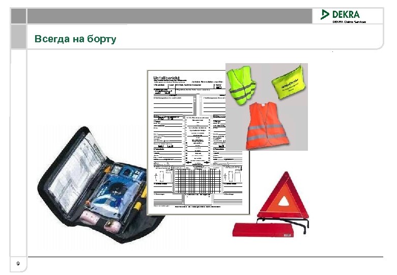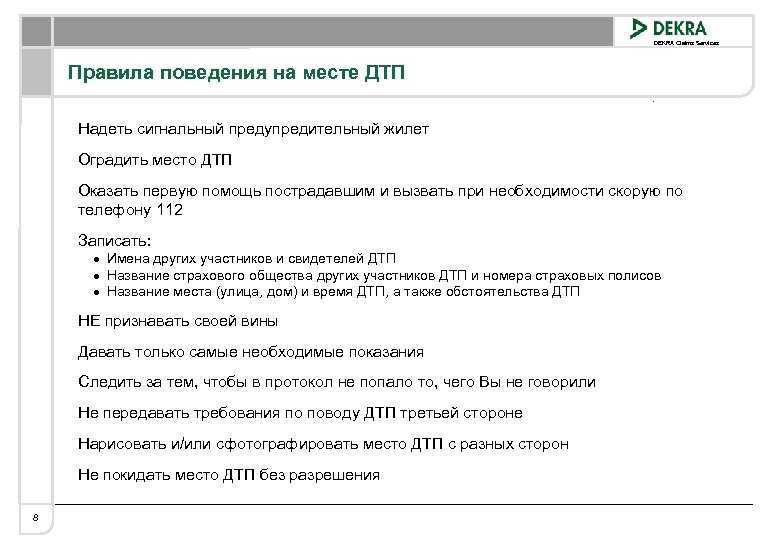 DEKRA Claims Services Правила поведения на месте ДТП Надеть сигнальный предупредительный жилет Оградить место ДТП Оказать первую помощь пострадавшим и вызвать при необходимости скорую по телефону 112 Записать: l l l Имена других участников и свидетелей ДТП Название страхового общества других участников ДТП и номера страховых полисов Название места (улица, дом) и время ДТП, а также обстоятельства ДТП НЕ признавать своей вины Давать только самые необходимые показания Следить за тем, чтобы в протокол не попало то, чего Вы не говорили Не передавать требования по поводу ДТП третьей стороне Нарисовать и/или сфотографировать место ДТП с разных сторон Не покидать место ДТП без разрешения 8