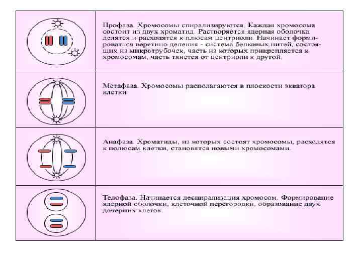 Состояние ядра в клетке а) Хромосомы, собравшись у полюсов, раскручиваются; происходит образование ядерной оболочки; заканчивается делением цитоплазмы б) Хромосомы располагаются в экваториальной плоскости клетки; прикрепление центромер к нитям веретена деления. в) Расхождение сестринских хроматид к полюсам клетки г) Расхождение центриолей и начало образования веретена деления; растворение ядерной оболочки; исчезновение ядрышка. Фазы митоза