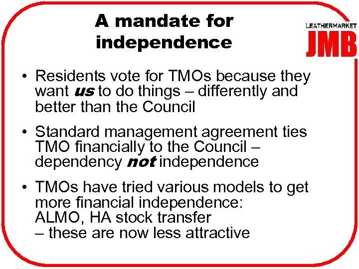A mandate for independence • Residents vote for TMOs because they want us to do things – differently and better than the Council • Standard management agreement ties TMO financially to the Council – dependency not independence • TMOs have tried various models to get more financial independence: ALMO, HA stock transfer – these are now less attractive
