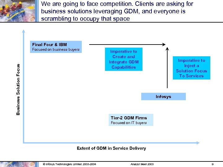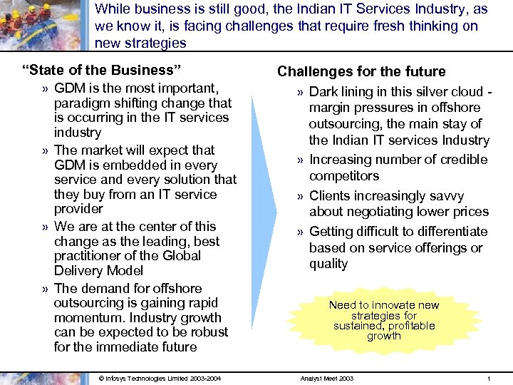 While business is still good, the Indian IT Services Industry, as we know it, is facing challenges that require fresh thinking on new strategies “State of the Business” » GDM is the most important, paradigm shifting change that is occurring in the IT services industry » The market will expect that GDM is embedded in every service and every solution that they buy from an IT service provider » We are at the center of this change as the leading, best practitioner of the Global Delivery Model » The demand for offshore outsourcing is gaining rapid momentum. Industry growth can be expected to be robust for the immediate future © Infosys Technologies Limited 2003 -2004 Challenges for the future » Dark lining in this silver cloud margin pressures in offshore outsourcing, the main stay of the Indian IT services Industry » Increasing number of credible competitors » Clients increasingly savvy about negotiating lower prices » Getting difficult to differentiate based on service offerings or quality Need to innovate new strategies for sustained, profitable growth Analyst Meet 2003 1
