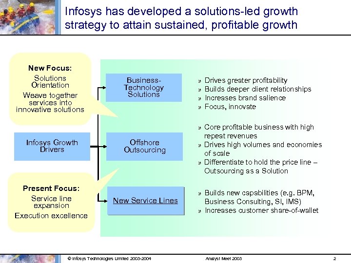 Infosys has developed a solutions-led growth strategy to attain sustained, profitable growth New Focus: Solutions Orientation Weave together services into innovative solutions Business. Technology Solutions » » Drives greater profitability Builds deeper client relationships Increases brand salience Focus, innovate » Core profitable business with high Infosys Growth Drivers Present Focus: Service line expansion Execution excellence Offshore Outsourcing New Service Lines © Infosys Technologies Limited 2003 -2004 repeat revenues » Drives high volumes and economies of scale » Differentiate to hold the price line – Outsourcing as a Solution » Builds new capabilities (e. g. BPM, Business Consulting, SI, IMS) » Increases customer share-of-wallet Analyst Meet 2003 2