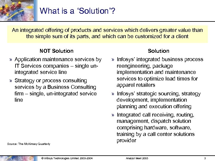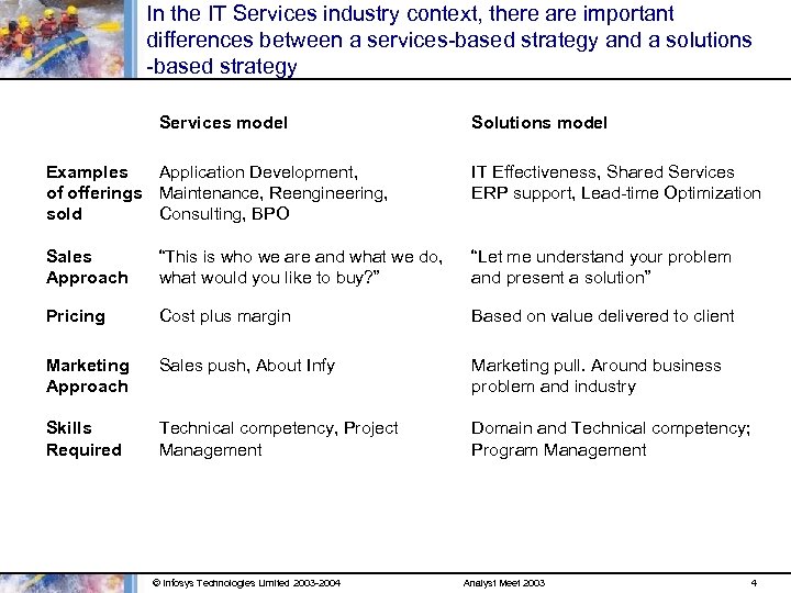 What is a ‘Solution’? An integrated offering of products and services which delivers greater value than the simple sum of its parts, and which can be customized for a client NOT Solution » Application maintenance services by IT Services companies – single unintegrated service line » Infosys’ integrated business process reengineering, package implementation and maintenance services to optimize lead times for apparel retailers » Strategy or process consulting services by a Business Consulting firm – single, un-integrated service line Source: The Mc. Kinsey Quarterly © Infosys Technologies Limited 2003 -2004 » Infosys’ strategic sourcing, strategy development, implementation planning and execution offering » Integrated call receiving, routing, management, dispatch solution comprising hardware, software, training by a call center solutions provider Analyst Meet 2003 3
