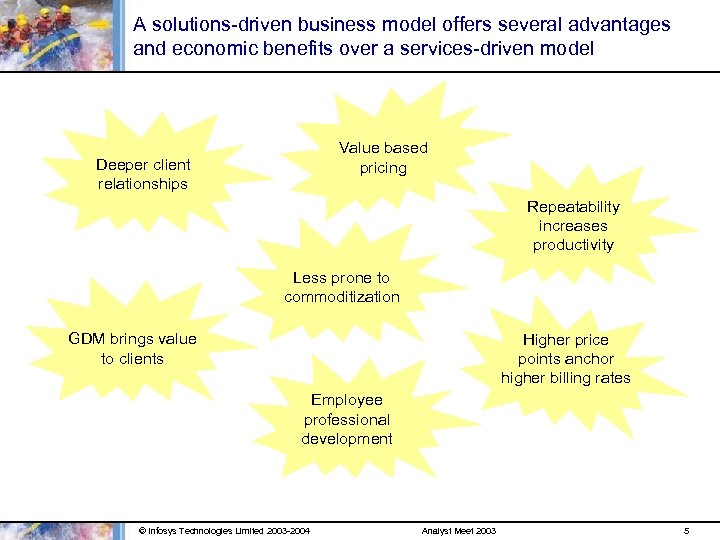 In the IT Services industry context, there are important differences between a services-based strategy and a solutions -based strategy Services model Solutions model Examples Application Development, of offerings Maintenance, Reengineering, sold Consulting, BPO IT Effectiveness, Shared Services ERP support, Lead-time Optimization Sales Approach “This is who we are and what we do, what would you like to buy? ” “Let me understand your problem and present a solution” Pricing Cost plus margin Based on value delivered to client Marketing Approach Sales push, About Infy Marketing pull. Around business problem and industry Skills Required Technical competency, Project Management Domain and Technical competency; Program Management © Infosys Technologies Limited 2003 -2004 Analyst Meet 2003 4