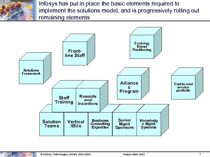 However, significant changes are required to make a successful transition into a solutions-driven model Sales & Marketing Team-selling Specialist sales staff ‘Trusted Partner’ branding Targeted messaging Organization Vertical or Domain based structure Cross-functional collaboration and teams Human Resources Recruiting of specialists Deep domain skills training Cross-staffing management Processes & Systems Integration across service lines Collaborative workflows Knowledge management tools © Infosys Technologies Limited 2003 -2004 Analyst Meet 2003 6