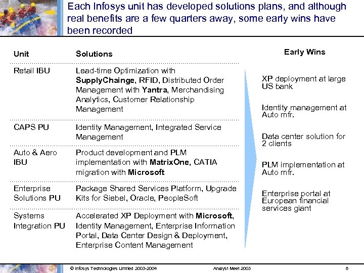 Infosys has put in place the basic elements required to implement the solutions model, and is progressively rolling out remaining elements Evolving Brand Positioning Frontline Staff Solutions Framework Alliance s Program Staff Training Solution Teams End-to-end service portfolio Rewards and Incentives Vertical IBUs Business Consulting Expertise © Infosys Technologies Limited 2003 -2004 Senior Mgmt Sponsors Knowledg e Mgmt Systems Analyst Meet 2003 7
