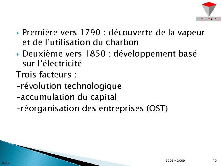 Première vers 1790 : découverte de la vapeur et de l’utilisation du charbon Deuxième vers 1850 : développement basé sur l’électricité Trois facteurs : -révolution technologique -accumulation du capital -réorganisation des entreprises (OST) RSI 7 2008 - 2009 10