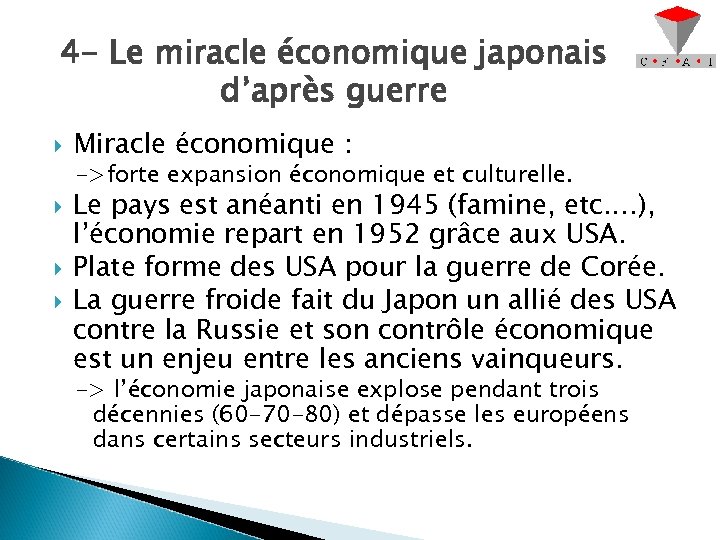 4 - Le miracle économique japonais d’après guerre Miracle économique : ->forte expansion économique et culturelle. Le pays est anéanti en 1945 (famine, etc. …), l’économie repart en 1952 grâce aux USA. Plate forme des USA pour la guerre de Corée. La guerre froide fait du Japon un allié des USA contre la Russie et son contrôle économique est un enjeu entre les anciens vainqueurs. -> l’économie japonaise explose pendant trois décennies (60 -70 -80) et dépasse les européens dans certains secteurs industriels.