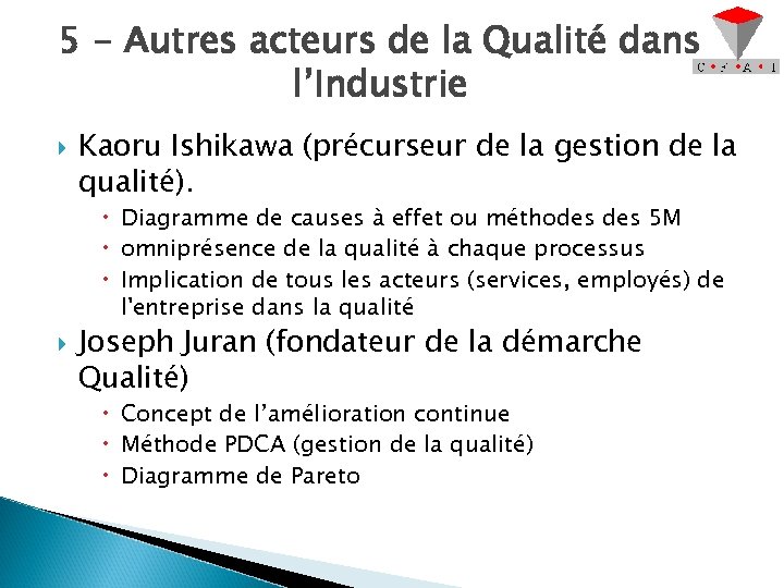 5 - Autres acteurs de la Qualité dans l’Industrie Kaoru Ishikawa (précurseur de la gestion de la qualité). Diagramme de causes à effet ou méthodes 5 M omniprésence de la qualité à chaque processus Implication de tous les acteurs (services, employés) de l'entreprise dans la qualité Joseph Juran (fondateur de la démarche Qualité) Concept de l’amélioration continue Méthode PDCA (gestion de la qualité) Diagramme de Pareto
