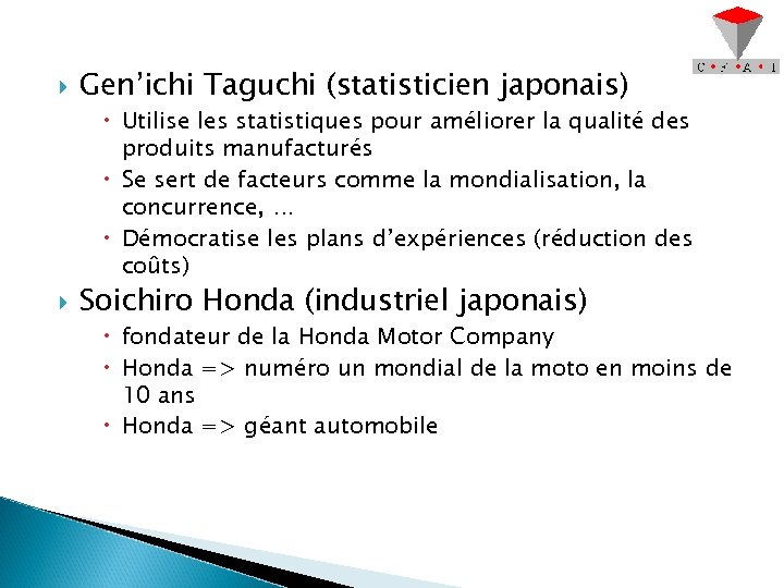 Gen’ichi Taguchi (statisticien japonais) Utilise les statistiques pour améliorer la qualité des produits manufacturés Se sert de facteurs comme la mondialisation, la concurrence, … Démocratise les plans d’expériences (réduction des coûts) Soichiro Honda (industriel japonais) fondateur de la Honda Motor Company Honda => numéro un mondial de la moto en moins de 10 ans Honda => géant automobile