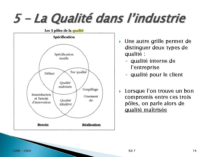 5 – La Qualité dans l’industrie 2008 - 2009 Une autre grille permet de distinguer deux types de qualité : ◦ qualité interne de l’entreprise ◦ qualité pour le client Lorsque l’on trouve un bon compromis entre ces trois pôles, on parle alors de qualité maîtrisée RSI 7 14