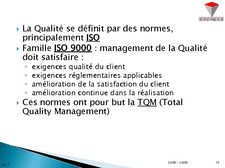 La Qualité se définit par des normes, principalement ISO Famille ISO 9000 : management de la Qualité doit satisfaire : ◦ ◦ RSI 7 exigences qualité du client exigences réglementaires applicables amélioration de la satisfaction du client amélioration continue dans la réalisation Ces normes ont pour but la TQM (Total Quality Management) 2008 - 2009 15