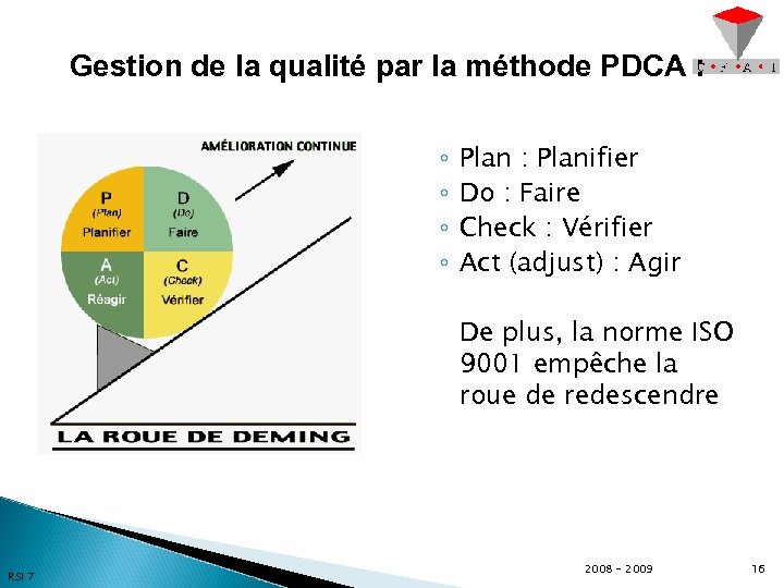 Gestion de la qualité par la méthode PDCA : ◦ ◦ Plan : Planifier Do : Faire Check : Vérifier Act (adjust) : Agir De plus, la norme ISO 9001 empêche la roue de redescendre RSI 7 2008 - 2009 16