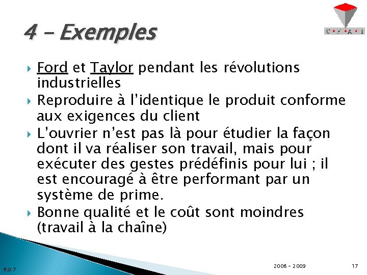 4 – Exemples RSI 7 Ford et Taylor pendant les révolutions industrielles Reproduire à l’identique le produit conforme aux exigences du client L’ouvrier n’est pas là pour étudier la façon dont il va réaliser son travail, mais pour exécuter des gestes prédéfinis pour lui ; il est encouragé à être performant par un système de prime. Bonne qualité et le coût sont moindres (travail à la chaîne) 2008 - 2009 17