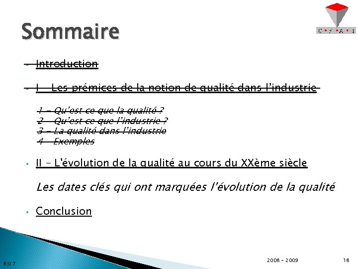 Sommaire • Introduction • I - Les prémices de la notion de qualité dans l’industrie 1 - Qu’est ce que la qualité ? 2 - Qu’est ce que l’industrie ? 3 - La qualité dans l’industrie 4 – Exemples • II - L'évolution de la qualité au cours du XXème siècle Les dates clés qui ont marquées l’évolution de la qualité • RSI 7 Conclusion 2008 - 2009 18