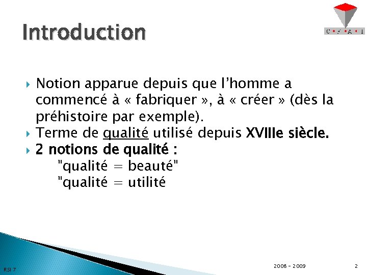 Introduction RSI 7 Notion apparue depuis que l’homme a commencé à « fabriquer » , à « créer » (dès la préhistoire par exemple). Terme de qualité utilisé depuis XVIIIe siècle. 2 notions de qualité : "qualité = beauté" "qualité = utilité 2008 - 2009 2