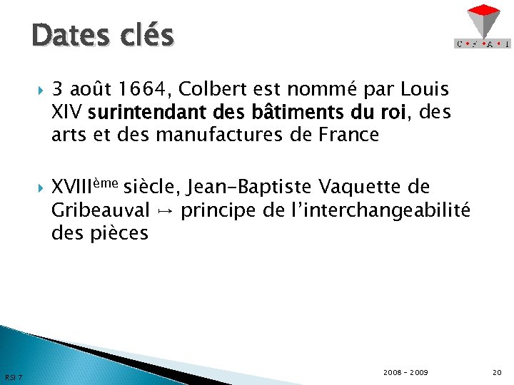 Dates clés RSI 7 3 août 1664, Colbert est nommé par Louis XIV surintendant des bâtiments du roi, des arts et des manufactures de France XVIIIème siècle, Jean-Baptiste Vaquette de Gribeauval ↦ principe de l’interchangeabilité des pièces 2008 - 2009 20