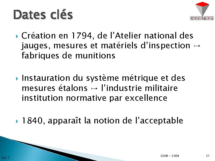 Dates clés RSI 7 Création en 1794, de l’Atelier national des jauges, mesures et matériels d’inspection ↦ fabriques de munitions Instauration du système métrique et des mesures étalons ↦ l’industrie militaire institution normative par excellence 1840, apparaît la notion de l’acceptable 2008 - 2009 21