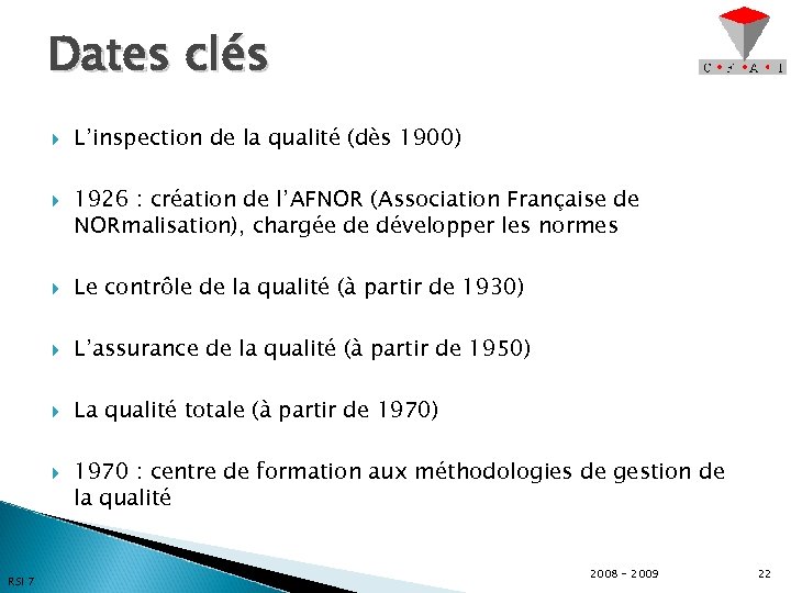 Dates clés L’inspection de la qualité (dès 1900) 1926 : création de l’AFNOR (Association Française de NORmalisation), chargée de développer les normes Le contrôle de la qualité (à partir de 1930) L’assurance de la qualité (à partir de 1950) La qualité totale (à partir de 1970) RSI 7 1970 : centre de formation aux méthodologies de gestion de la qualité 2008 - 2009 22