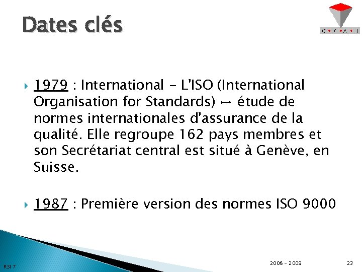 Dates clés RSI 7 1979 : International - L'ISO (International Organisation for Standards) ↦ étude de normes internationales d'assurance de la qualité. Elle regroupe 162 pays membres et son Secrétariat central est situé à Genève, en Suisse. 1987 : Première version des normes ISO 9000 2008 - 2009 23