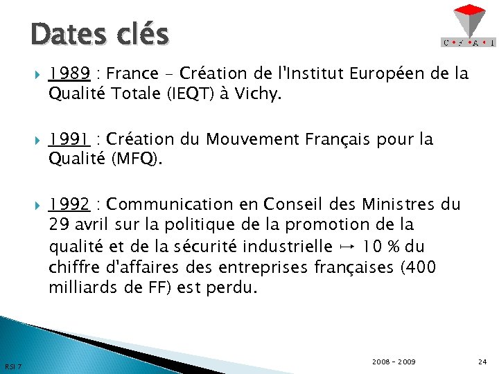 Dates clés RSI 7 1989 : France - Création de l'Institut Européen de la Qualité Totale (IEQT) à Vichy. 1991 : Création du Mouvement Français pour la Qualité (MFQ). 1992 : Communication en Conseil des Ministres du 29 avril sur la politique de la promotion de la qualité et de la sécurité industrielle ↦ 10 % du chiffre d'affaires des entreprises françaises (400 milliards de FF) est perdu. 2008 - 2009 24