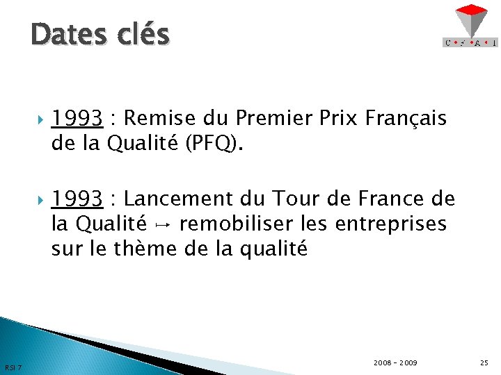 Dates clés RSI 7 1993 : Remise du Premier Prix Français de la Qualité (PFQ). 1993 : Lancement du Tour de France de la Qualité ↦ remobiliser les entreprises sur le thème de la qualité 2008 - 2009 25