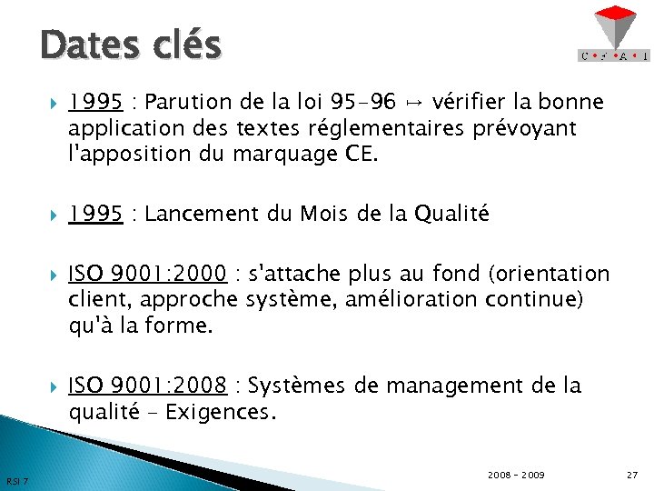 Dates clés RSI 7 1995 : Parution de la loi 95 -96 ↦ vérifier la bonne application des textes réglementaires prévoyant l'apposition du marquage CE. 1995 : Lancement du Mois de la Qualité ISO 9001: 2000 : s'attache plus au fond (orientation client, approche système, amélioration continue) qu'à la forme. ISO 9001: 2008 : Systèmes de management de la qualité – Exigences. 2008 - 2009 27