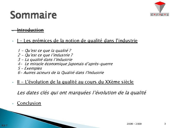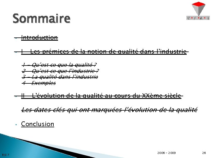 Sommaire • Introduction • I - Les prémices de la notion de qualité dans l’industrie 1 - Qu’est ce que la qualité ? 2 - Qu’est ce que l’industrie ? 3 - La qualité dans l’industrie 4 – Exemples • II - L'évolution de la qualité au cours du XXème siècle Les dates clés qui ont marquées l’évolution de la qualité • RSI 7 Conclusion 2008 - 2009 28