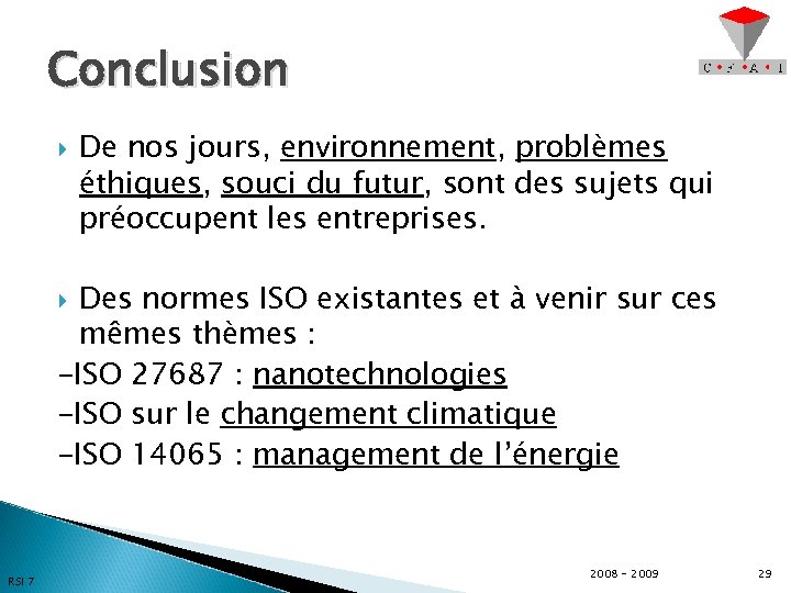 Conclusion De nos jours, environnement, problèmes éthiques, souci du futur, sont des sujets qui préoccupent les entreprises. Des normes ISO existantes et à venir sur ces mêmes thèmes : -ISO 27687 : nanotechnologies -ISO sur le changement climatique -ISO 14065 : management de l’énergie RSI 7 2008 - 2009 29