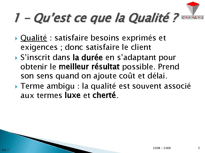 1 – Qu’est ce que la Qualité ? RSI 7 Qualité : satisfaire besoins exprimés et exigences ; donc satisfaire le client S’inscrit dans la durée en s’adaptant pour obtenir le meilleur résultat possible. Prend son sens quand on ajoute coût et délai. Terme ambigu : la qualité est souvent associé aux termes luxe et cherté. 2008 - 2009 5