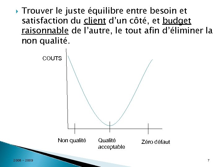 Trouver le juste équilibre entre besoin et satisfaction du client d’un côté, et budget raisonnable de l’autre, le tout afin d’éliminer la non qualité. COUTS Non qualité 2008 - 2009 Qualité acceptable Zéro défaut 7