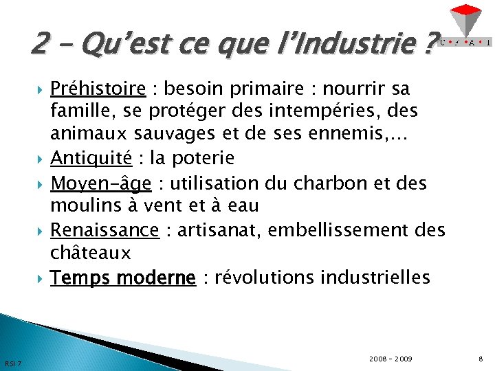 2 – Qu’est ce que l’Industrie ? RSI 7 Préhistoire : besoin primaire : nourrir sa famille, se protéger des intempéries, des animaux sauvages et de ses ennemis, … Antiquité : la poterie Moyen-âge : utilisation du charbon et des moulins à vent et à eau Renaissance : artisanat, embellissement des châteaux Temps moderne : révolutions industrielles 2008 - 2009 8
