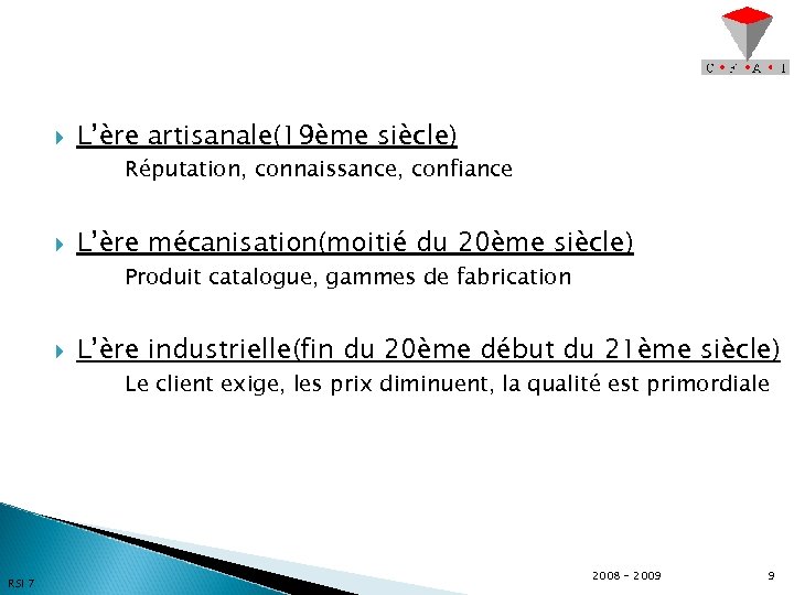 L’ère artisanale(19ème siècle) Réputation, connaissance, confiance L’ère mécanisation(moitié du 20ème siècle) Produit catalogue, gammes de fabrication L’ère industrielle(fin du 20ème début du 21ème siècle) Le client exige, les prix diminuent, la qualité est primordiale RSI 7 2008 - 2009 9