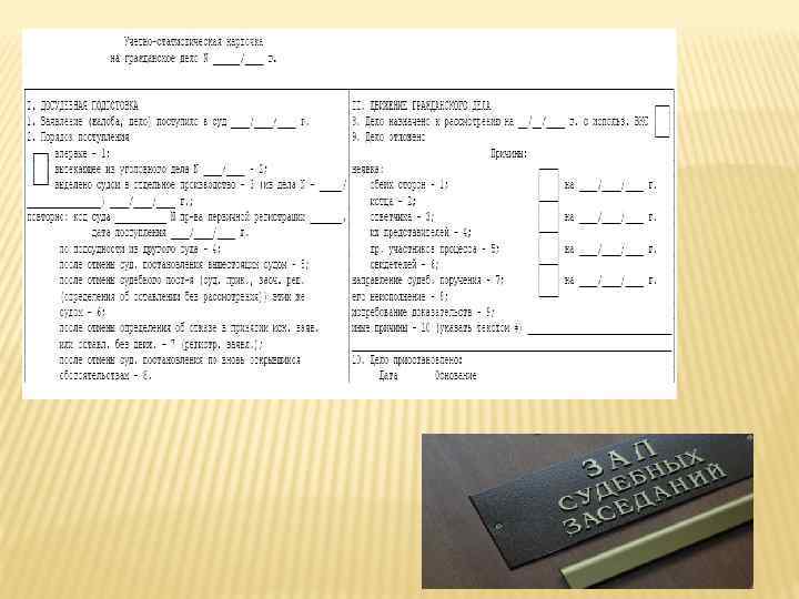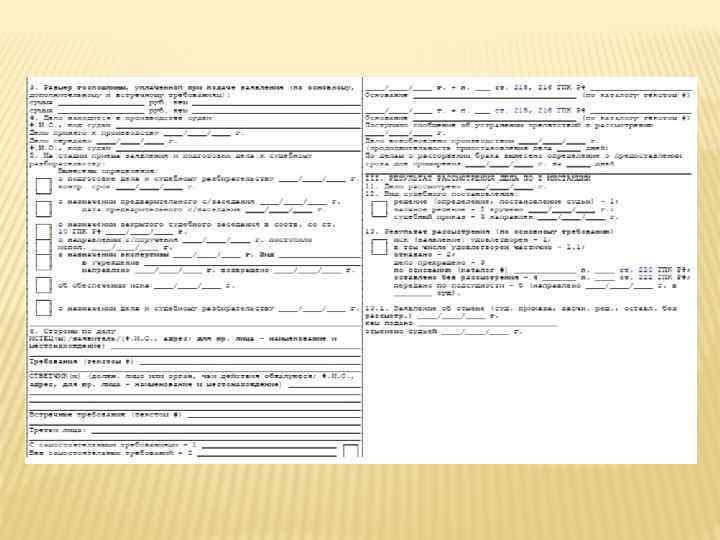 УЧЁТНО-СТАТИСТИЧЕСКАЯ КАРТОЧКА ДЛЯ ГРАЖДАНСКИХ ДЕЛ (ФОРМА № 6 Р) По гражданскому делу заводится только один экземпляр карточки формы № 6 р; Алфавитный указатель по делам искового производства ведётся на каждого ответчика; по делам, вытекающим из публичных отношений, - на подателя жалобы; по делам, вытекающим из налоговых отношений, - на налогоплательщика; по делам особого производства - на заявителя; В автоматизированных программах, в которых ведётся учет гражданских дел, должно быть обеспечено формирование запросов по требованиям истцов и ответчиков, заявителей в соответствии с алфавитными указателями; Заявления, по которым вынесены определения об отказе в их принятии, о возвращении заявления или оставлении без движения, регистрируются в автоматизированной базе данных с формированием информации в журнале формы № 6. 1.
