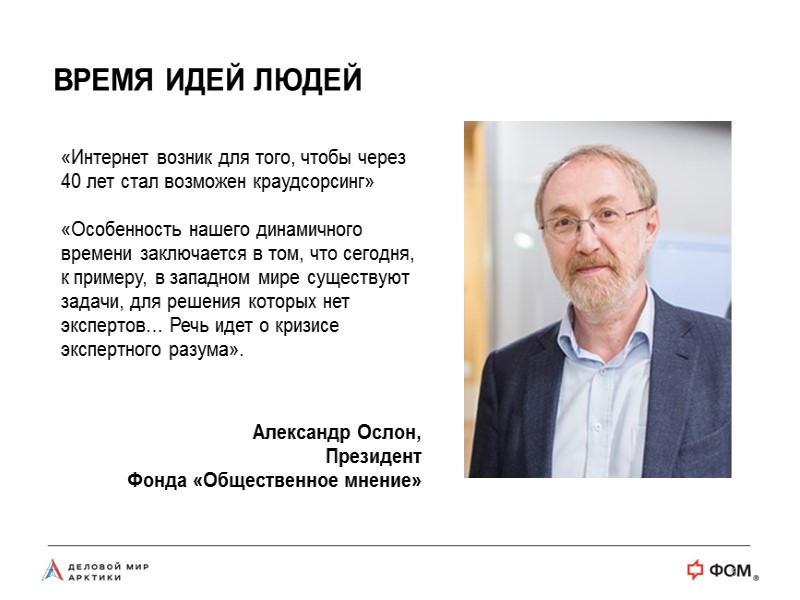 5 ВРЕМЯ ИДЕЙ ЛЮДЕЙ «Интернет возник для того, чтобы через 40 лет стал возможен краудсорсинг» «Особенность нашего динамичного времени заключается в том, что сегодня, к примеру, в западном мире существуют задачи, для решения которых нет экспертов… Речь идет о кризисе экспертного разума». Александр Ослон, Президент Фонда «Общественное мнение»