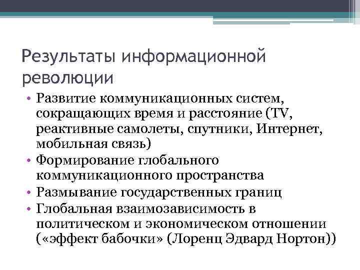 Результаты информационной революции • Развитие коммуникационных систем, сокращающих время и расстояние (TV, реактивные самолеты, спутники, Интернет, мобильная связь) • Формирование глобального коммуникационного пространства • Размывание государственных границ • Глобальная взаимозависимость в политическом и экономическом отношении ( «эффект бабочки» (Лоренц Эдвард Нортон))