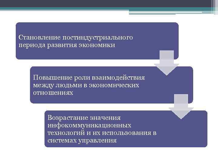 Становление постиндустриального периода развития экономики Повышение роли взаимодействия между людьми в экономических отношениях Возрастание значения инфокоммуникационных технологий и их использования в системах управления