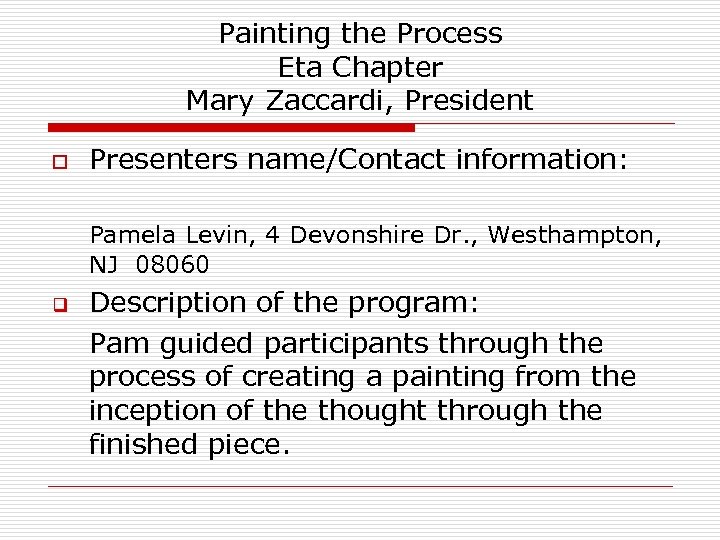 Painting the Process Eta Chapter Mary Zaccardi, President o Presenters name/Contact information: Pamela Levin, 4 Devonshire Dr. , Westhampton, NJ 08060 q Description of the program: Pam guided participants through the process of creating a painting from the inception of the thought through the finished piece.