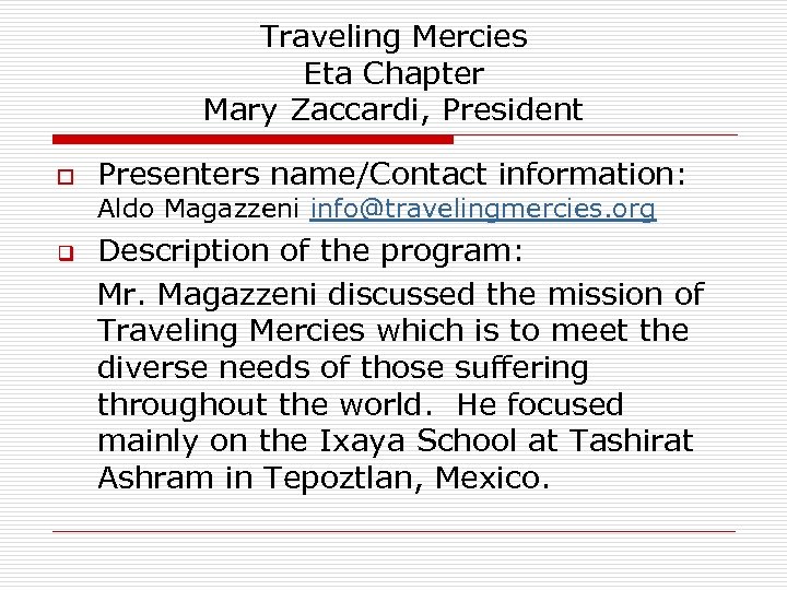 Traveling Mercies Eta Chapter Mary Zaccardi, President o Presenters name/Contact information: Aldo Magazzeni info@travelingmercies. org q Description of the program: Mr. Magazzeni discussed the mission of Traveling Mercies which is to meet the diverse needs of those suffering throughout the world. He focused mainly on the Ixaya School at Tashirat Ashram in Tepoztlan, Mexico.