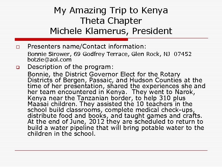 My Amazing Trip to Kenya Theta Chapter Michele Klamerus, President o Presenters name/Contact information: Bonnie Sirower, 69 Godfrey Terrace, Glen Rock, NJ 07452 botzie@aol. com q Description of the program: Bonnie, the District Governor Elect for the Rotary Districts of Bergen, Passaic, and Hudson Counties at the time of her presentation, shared the experiences she and her team encountered in Kenya. They went to Narok, Kenya near the Tanzanian border, to help 310 plus Maasai children. They assisted the 10 teachers in the school build classrooms, complete medical check-ups, distribute food and books, and taught games and crafts. At the end of June, 2012 they are scheduled to return to build a water pipeline that will bring potable water to the children in the school.