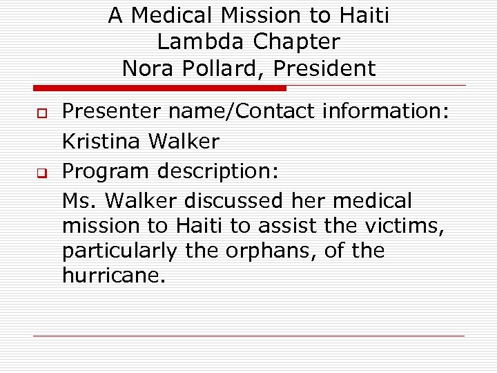 A Medical Mission to Haiti Lambda Chapter Nora Pollard, President o q Presenter name/Contact information: Kristina Walker Program description: Ms. Walker discussed her medical mission to Haiti to assist the victims, particularly the orphans, of the hurricane.