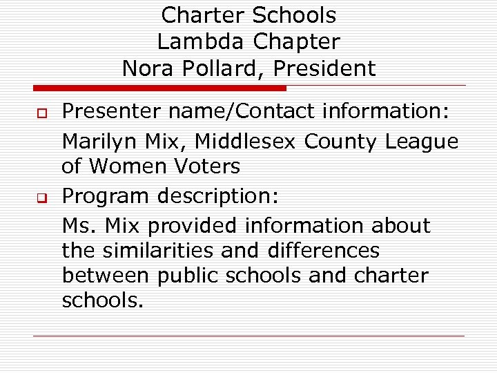 Charter Schools Lambda Chapter Nora Pollard, President o q Presenter name/Contact information: Marilyn Mix, Middlesex County League of Women Voters Program description: Ms. Mix provided information about the similarities and differences between public schools and charter schools.