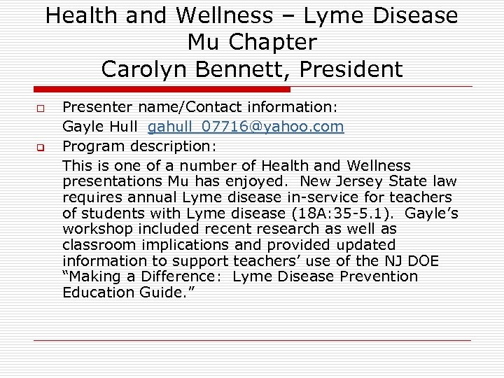 Health and Wellness – Lyme Disease Mu Chapter Carolyn Bennett, President o q Presenter name/Contact information: Gayle Hull gahull_07716@yahoo. com Program description: This is one of a number of Health and Wellness presentations Mu has enjoyed. New Jersey State law requires annual Lyme disease in-service for teachers of students with Lyme disease (18 A: 35 -5. 1). Gayle’s workshop included recent research as well as classroom implications and provided updated information to support teachers’ use of the NJ DOE “Making a Difference: Lyme Disease Prevention Education Guide. ”
