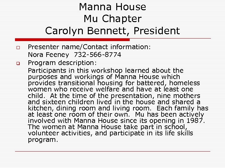 Manna House Mu Chapter Carolyn Bennett, President o q Presenter name/Contact information: Nora Feeney 732 -566 -8774 Program description: Participants in this workshop learned about the purposes and workings of Manna House which provides transitional housing for battered, homeless women who receive welfare and have at least one child. At the time of the presentation, nine mothers and sixteen children lived in the house and shared a kitchen, dining room and living room. Each family has at least one room of their own. Mu has been actively involved with Manna House since its opening in 1987. The women at Manna House take part in school, volunteer activities, and participate in its life skills program.