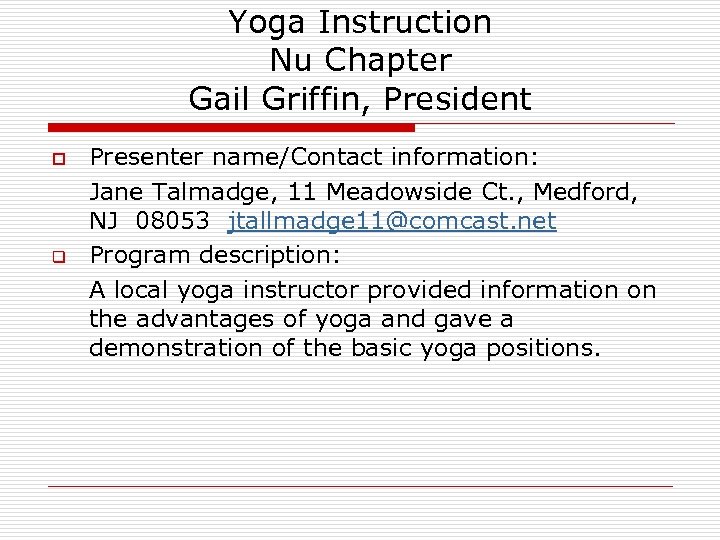 Yoga Instruction Nu Chapter Gail Griffin, President o q Presenter name/Contact information: Jane Talmadge, 11 Meadowside Ct. , Medford, NJ 08053 jtallmadge 11@comcast. net Program description: A local yoga instructor provided information on the advantages of yoga and gave a demonstration of the basic yoga positions.