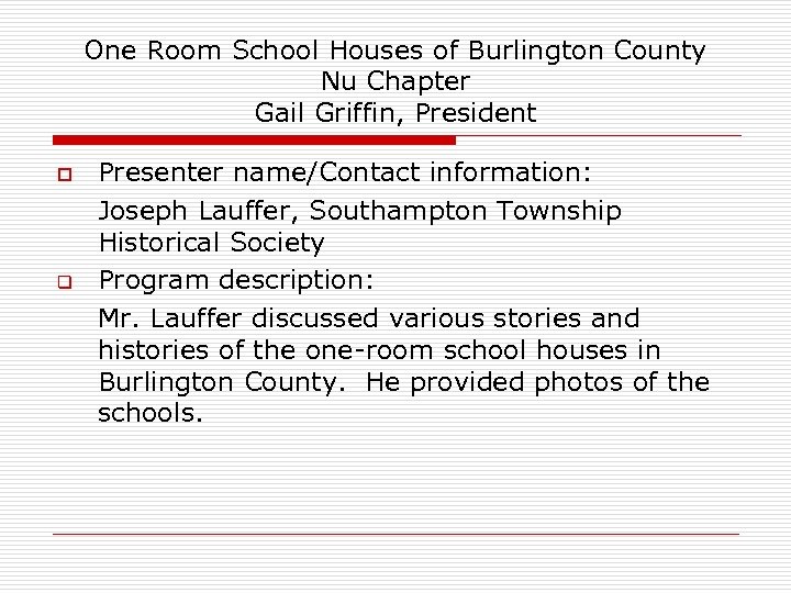 One Room School Houses of Burlington County Nu Chapter Gail Griffin, President o q Presenter name/Contact information: Joseph Lauffer, Southampton Township Historical Society Program description: Mr. Lauffer discussed various stories and histories of the one-room school houses in Burlington County. He provided photos of the schools.
