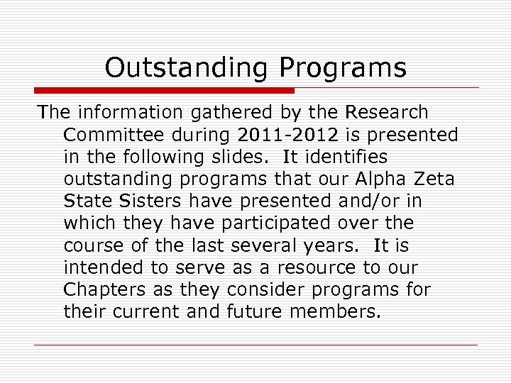 Outstanding Programs The information gathered by the Research Committee during 2011 -2012 is presented in the following slides. It identifies outstanding programs that our Alpha Zeta State Sisters have presented and/or in which they have participated over the course of the last several years. It is intended to serve as a resource to our Chapters as they consider programs for their current and future members.