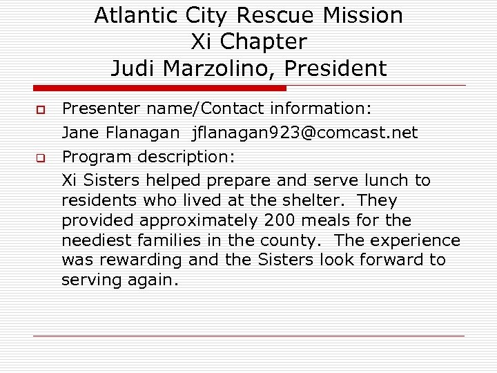 Atlantic City Rescue Mission Xi Chapter Judi Marzolino, President o q Presenter name/Contact information: Jane Flanagan jflanagan 923@comcast. net Program description: Xi Sisters helped prepare and serve lunch to residents who lived at the shelter. They provided approximately 200 meals for the neediest families in the county. The experience was rewarding and the Sisters look forward to serving again.
