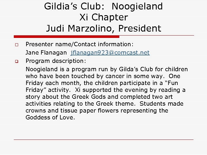 Gildia’s Club: Noogieland Xi Chapter Judi Marzolino, President o q Presenter name/Contact information: Jane Flanagan jflanagan 923@comcast. net Program description: Noogieland is a program run by Gilda’s Club for children who have been touched by cancer in some way. One Friday each month, the children participate in a “Fun Friday” activity. Xi supported the evening by reading a story about the Greek Gods and completed two art activities relating to the Greek theme. Students made crowns and tissue paper flowers representing the Goddess of Love.