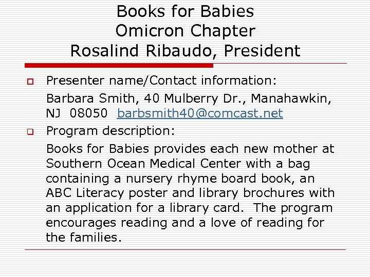 Books for Babies Omicron Chapter Rosalind Ribaudo, President o q Presenter name/Contact information: Barbara Smith, 40 Mulberry Dr. , Manahawkin, NJ 08050 barbsmith 40@comcast. net Program description: Books for Babies provides each new mother at Southern Ocean Medical Center with a bag containing a nursery rhyme board book, an ABC Literacy poster and library brochures with an application for a library card. The program encourages reading and a love of reading for the families.